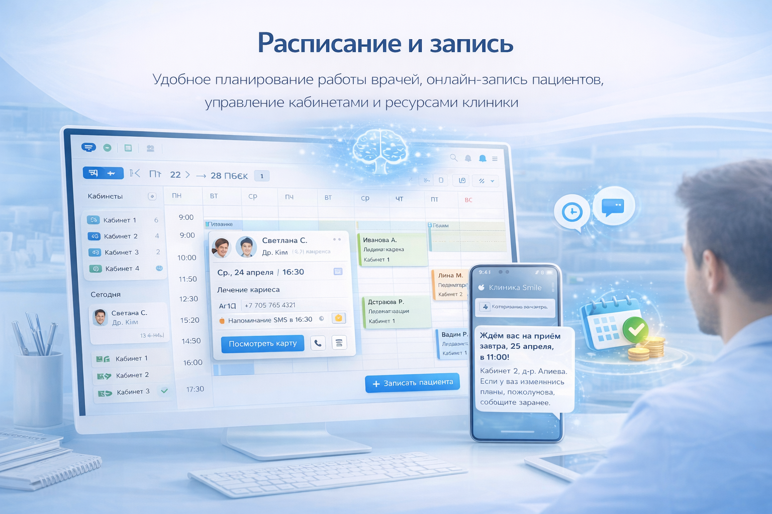 Удобное планирование работы врачей, онлайн-запись пациентов, управление кабинетами и ресурсами клиники