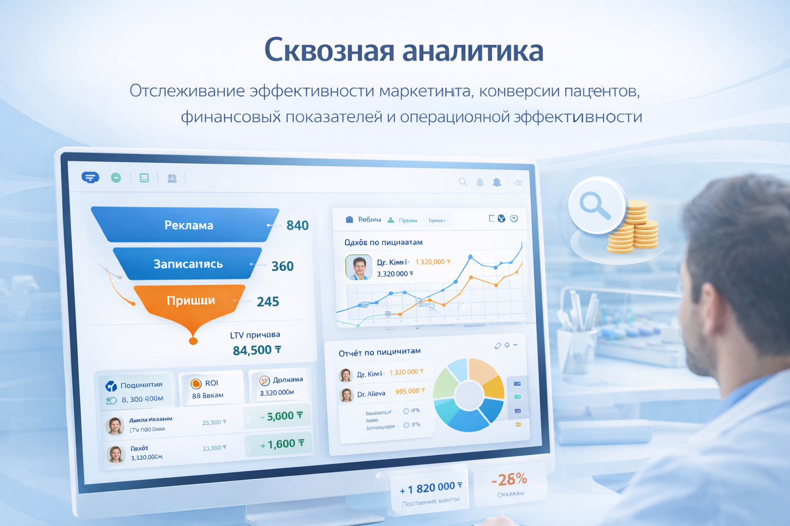 Отслеживание эффективности маркетинга, конверсии пациентов, финансовых показателей и операционной эффективности